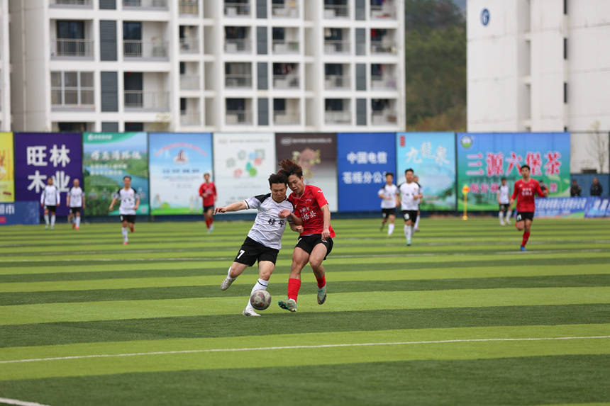 “球进了!”1月31日,苍梧县石桥镇东安社区体育休闲公园足球场爆发出雷鸣般的欢呼。梧州市苍梧县六堡茶队抓住进攻契机,团队间流畅配合,队员接球后顺势破门得分。
