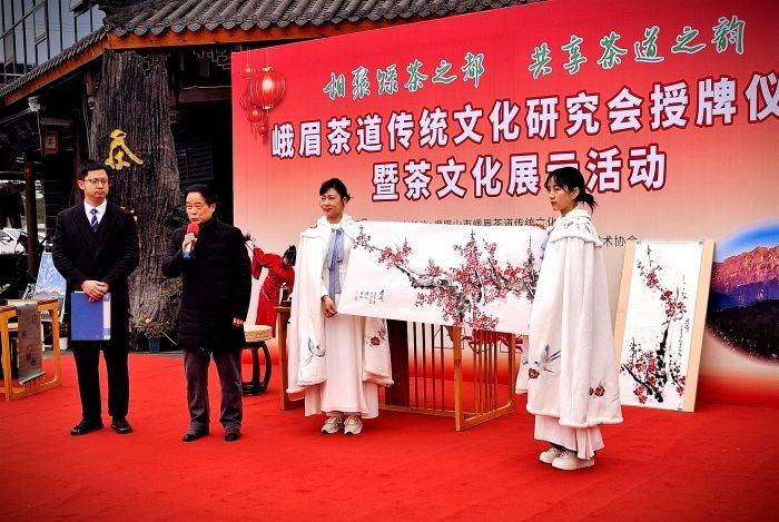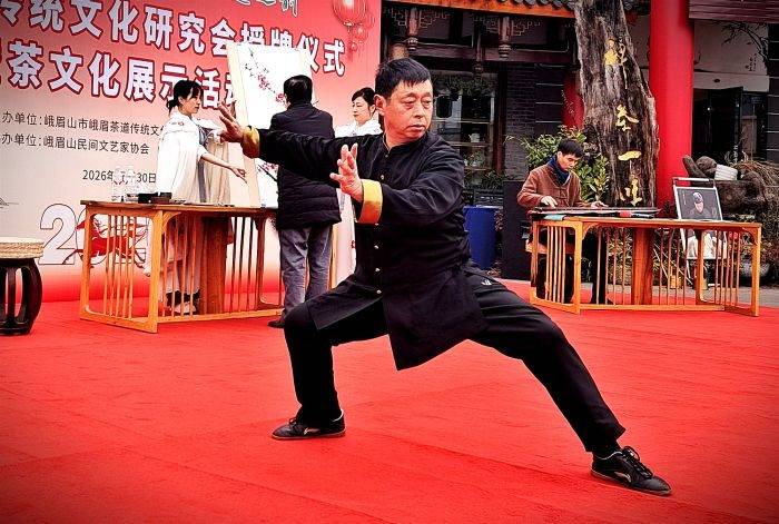 茶文化展示活动中,峨眉山市民间文艺家协会主席、著名花鸟画家林松现场作《红梅报春图》,并赠予峨眉山市峨眉茶道传统文化研究会。“峨眉武术”国家级非遗传承人王超携弟子李娟共赴盛会,展示峨眉功夫,彰显茶武互融发展的文化内涵。