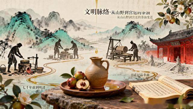 从河姆渡陶罐中的一抹油痕,到《本草纲目》里的养生良方;从山野采集到规模化种植,山茶油的使用史,就是一部浓缩的中华文明发展史。它见证了我们从依赖自然馈赠,到主动改造自然、创造价值的全过程。
