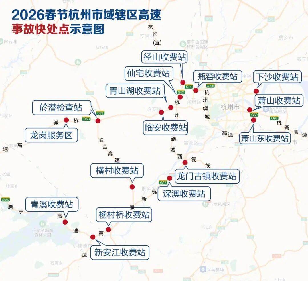 春节期间,杭州公安交警在重点路段收费站设置事故快速处理点16处,更好地方便群众,服务司乘人员。但与此同时还是要重点提醒广大驾驶员,高速行车,做好车况性能检查,避免病车上路,避免不必要的麻烦,提前规划路线,做全出行准备,遵守交通规则,确保平安顺畅出行。