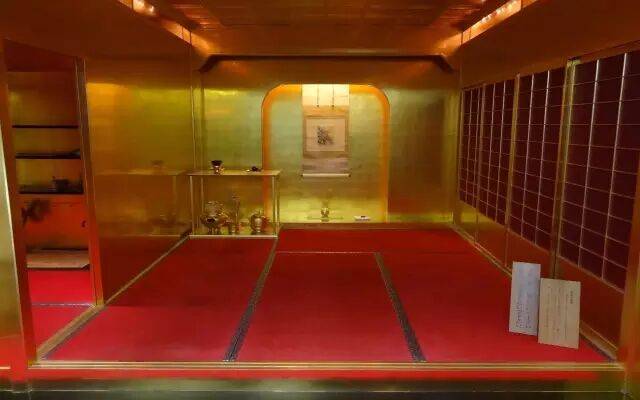 当时丰臣秀吉号召天下人举办茶会,贵族们争相比较谁比谁更土豪更金碧辉煌。做主人的霸主丰臣秀吉乾脆用纯金箔打造了一个黄金茶室。