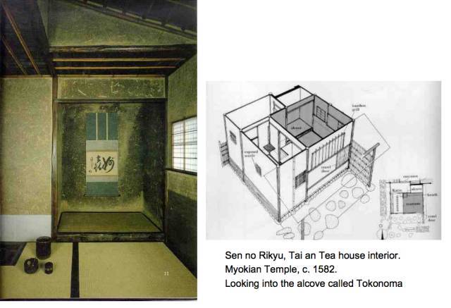 茶室的墙壁是用简陋的土墙做成的,抹上一条四五寸宽的稻草和泥土混合的涂料。他用简陋的建筑、贫乏的陈设直接迎战土豪们的生活方式及价值观,用最褴褛的茶室空间接待贵族及武士们。