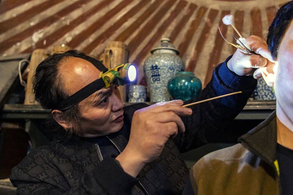 在人民公园的鹤鸣茶社,许多“茶博士”穿梭在人群中,手中提着冒热气的铜壶,身影忙碌而熟练;几位采耳师傅手持小巧的工具细致操作,头灯的光束聚焦在顾客耳畔,那种独特的酥麻与舒适是成都慢生活的代表。