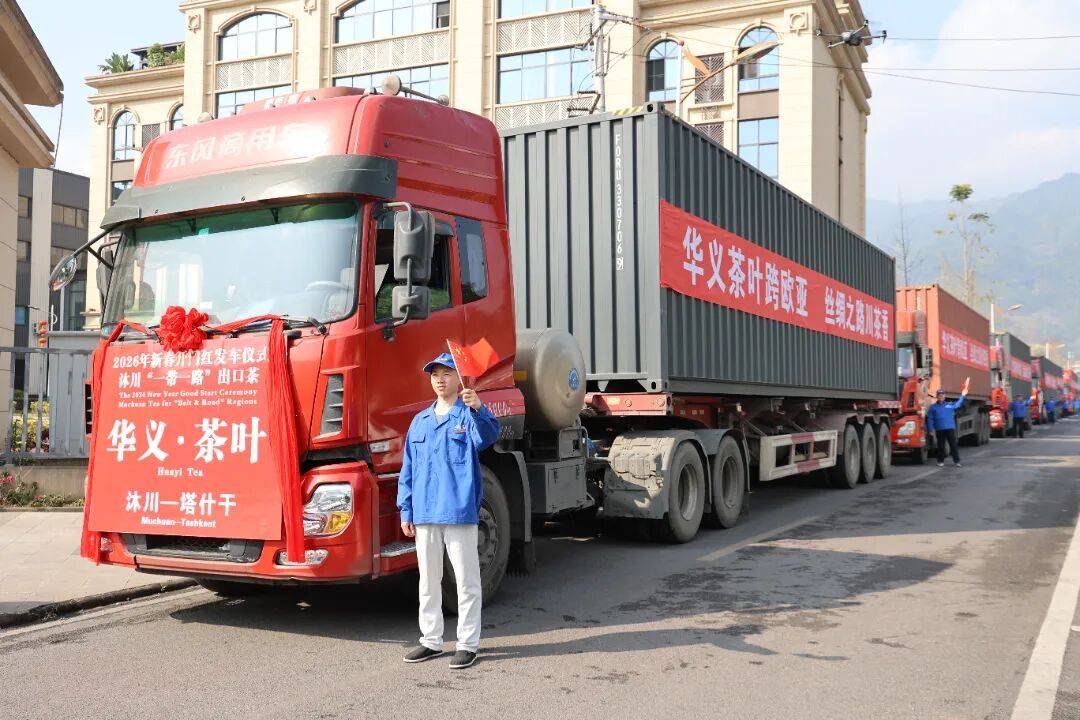 2月27日,沐川县2026年“拼开局 抢进度”出口“一带一路”茶叶产品千万外贸订单发车仪式在四川华义生物科技有限公司举行。随着发车指令下达,10辆满载“沐川造”茶叶的货车鸣笛启程,驶往中亚市场,标志着沐川茶产业在新春伊始成功拿下千万外贸订单,实现外贸出口“开门红”。