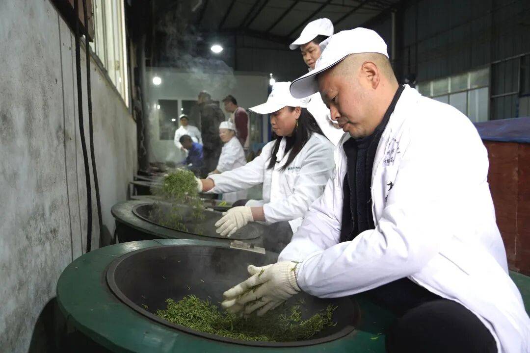 “我正在进行的这道工序是杀青,火温要到300摄氏度以上才能下锅,下锅之后火温不能太高,火温高了容易焦边。”炒茶师傅吴龙芬告诉记者,每年的采茶季都是她最忙碌的时候,上午采茶,下午炒茶,对炒制过程中的每一道程序她都已经熟练掌握。