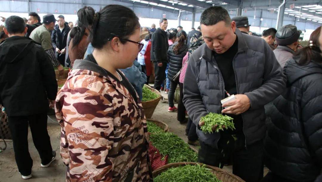 交易一开始,市场内便人头攒动。茶商们穿行其间,仔细查看茶叶的色泽、形态,俯身闻嗅清新的茶香,并不时与茶农询价、议价。随后,称重、计价、转账……各个环节一气呵成,忙碌而有序。市场上此起彼伏的报价声、爽朗的交谈声和交易达成后的欢笑声交织在一起,处处洋溢着春茶交易的热烈与喜悦。