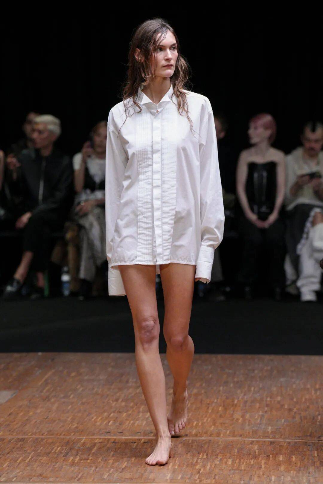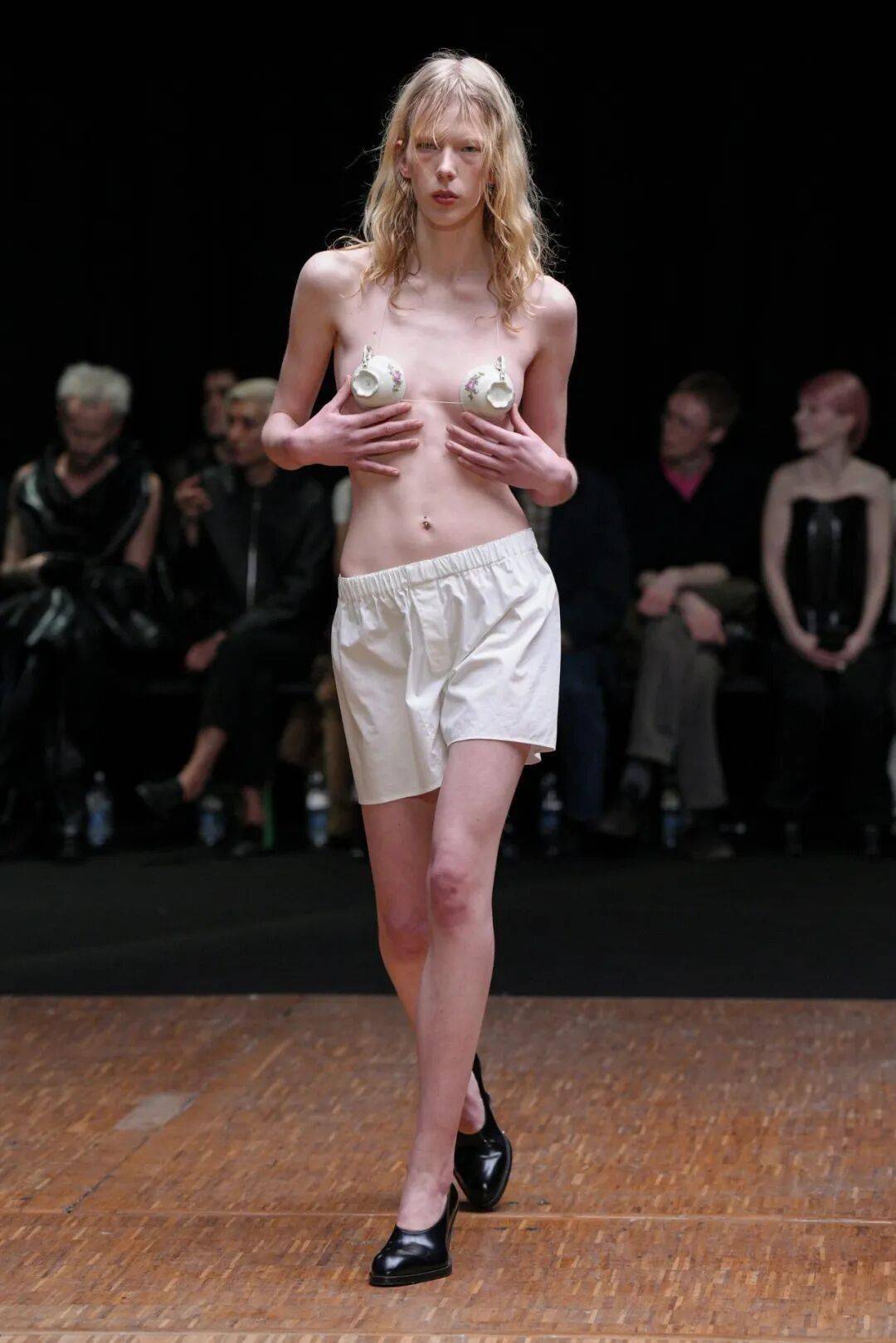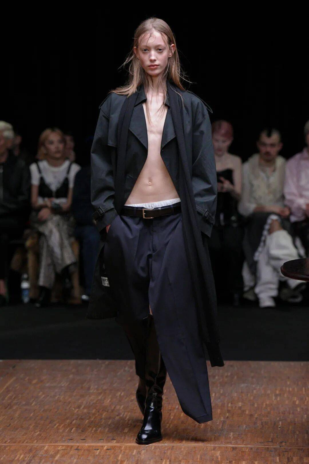 开场造型被她形容为“围裙式”:无背大衣与长裤之下,内裤轮廓若隐若现。