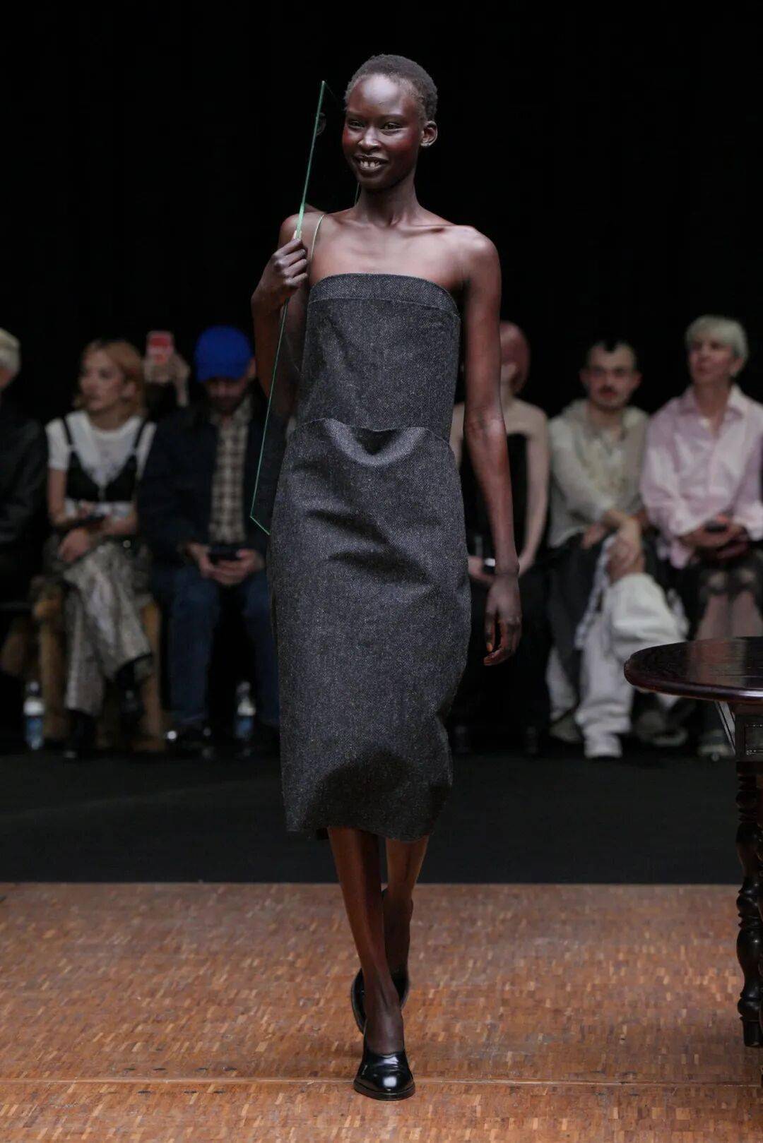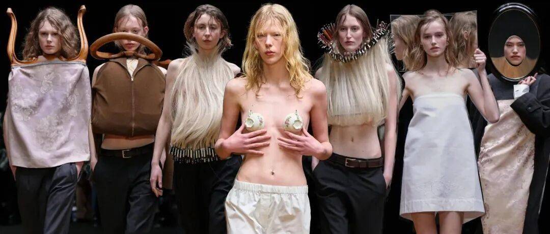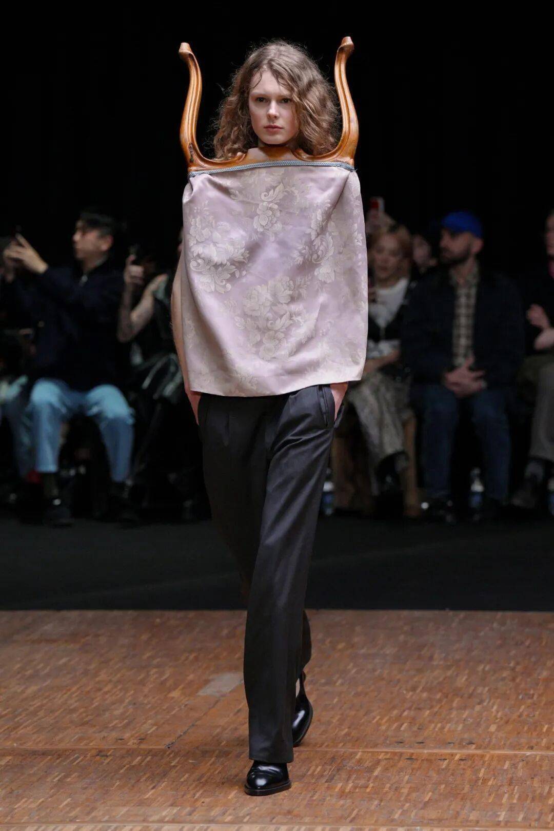 “家”的概念被多层次地解构。秀场被布置成一个带有围墙和深色长木桌的空间,直观地唤起“家”的意象。而服装本身则成为承载记忆与历史的移动家园:茶杯被拼缀成精致的微型胸衣,地毯化身温暖的短斗篷,椅子的结构部件则被融入服装的廓形之中。这些来自家居空间的“旧物”在Larsson手中获得新生,它们脱离了原有语境,被“重新框架”,成为探索身份的新载体。