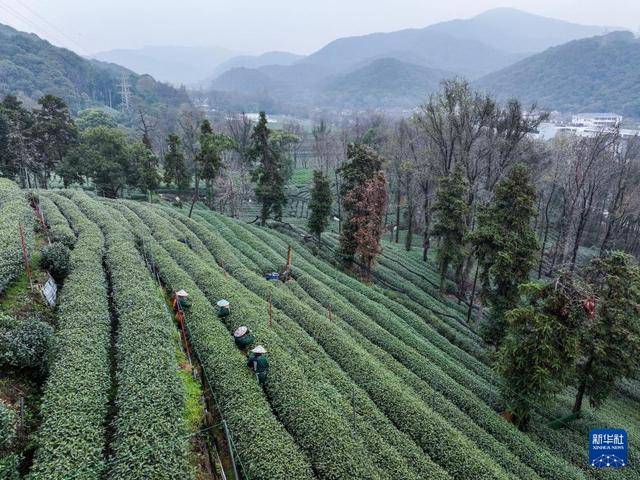 3月19日,梅家坞村的茶农在采摘西湖龙井“明前茶”(无人机照片)。新华社记者 徐昱 摄
