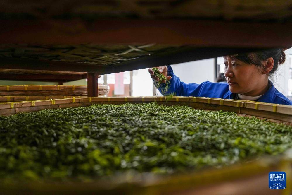 3月20日,在苏州市吴中区西山国家现代农业示范园金海华碧水缘茶叶基地,工作人员将采摘的茶叶鲜叶进行摊青。