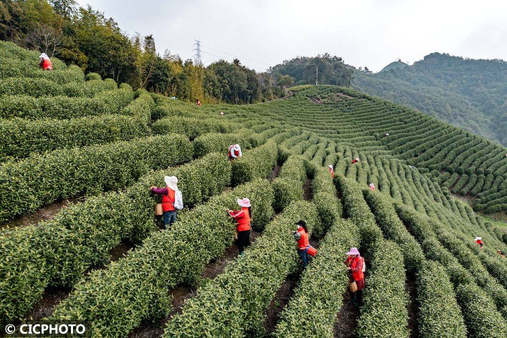 ↑2026年3月20日,采茶工在浙江省湖州市吴兴区埭溪镇长林农场采茶。CICPHOTO/何伟卫 摄