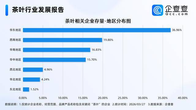 企查查数据显示,截至3月27日,国内现存茶叶相关企业165.17万家。近十年我国茶叶相关企业年末存量呈稳步增长态势,2025年末存量达164.14万家,较2016年增长约181.2%,反映出茶产业市场活力持续释放。从企业成立年限分布看,成立5~10年的企业占比最高,达38.58%。茶叶相关企业区域分布呈现明显集聚特征,华东地区占比最高,达36.96%。注册量方面,2025年全年注册13.9万家,截至目前,今年已注册2.58万家。
