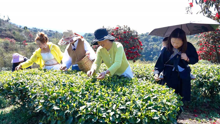 游客沉浸式体验采茶乐趣。