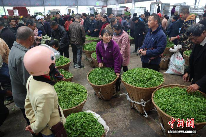 4月1日,四川省雅安市名山区一茶叶交易市场持续火爆。临近清明节,当地的明前茶迎来采摘、购销旺季。中新社记者 张浪 摄
