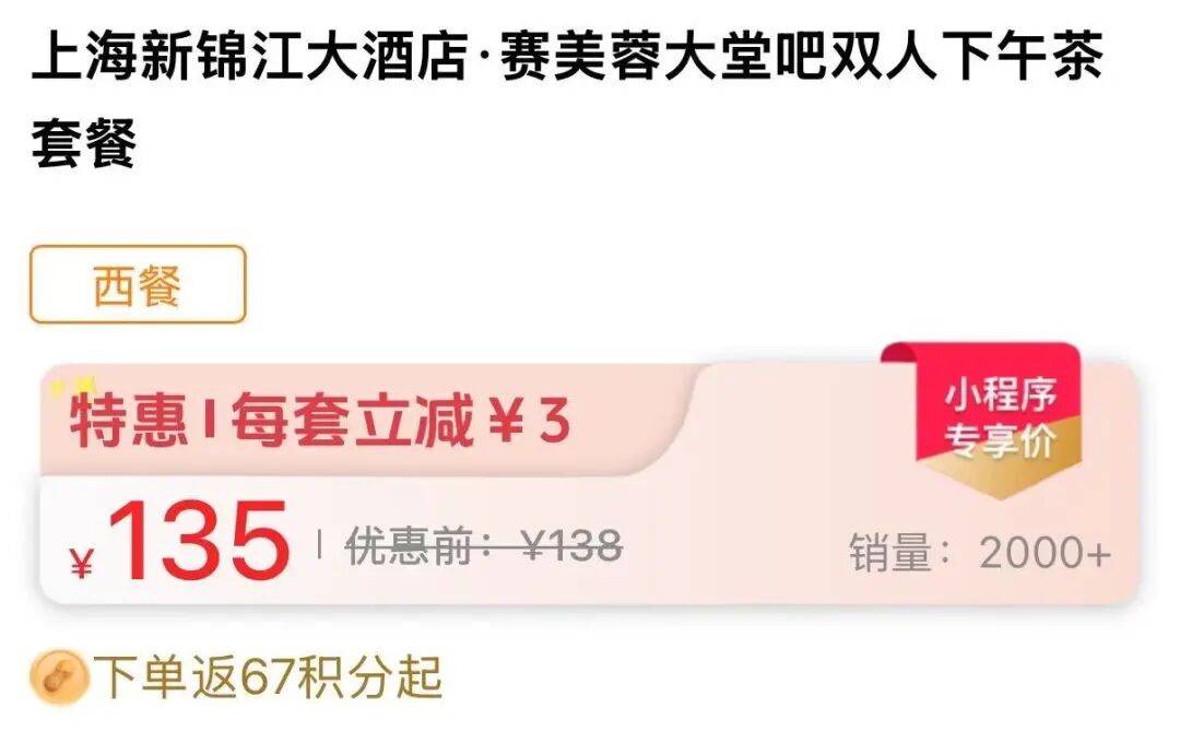 在被默认“高消费”的淮海路商圈,新锦江再一次直接推出双人下午茶套餐,135元/套,人均67.5元的价格,就能在这里度过惬意的午后时光。