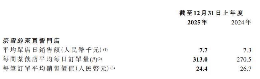 记者注意到,虽然奈雪的茶“忍痛”关掉了一部分门店,但留存门店的运营效率也出现显著提升。2025年,奈雪的茶直营门店平均单店日销售额从2024年的7300元增长至7700元,同比增长5.2%;单店日均订单量从270.5单提升至313单,同比提升15.7%。