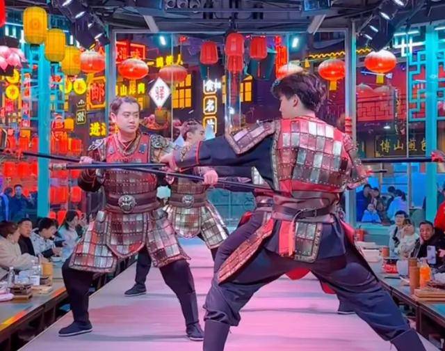 市场南侧的“阿淄烧烤·齐风淄宴”推出了沉浸式历史舞台剧《齐风淄宴》,每天午间和晚间精彩上演,演员生动演绎从姜子牙封齐到近代商埠风云,三千年齐文化如画卷展开。