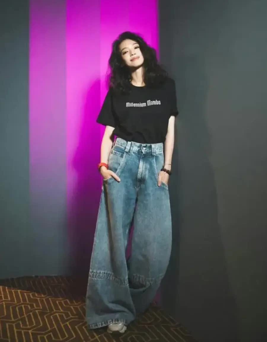 黑色T恤搭配牛仔阔腿裤,字母元素使造型简约不失个性,把衣摆塞入裤装中,看似简单的细节,不仅突出了腰线位置,视觉上提升了整个身材比例,使整个身形看起来更加高挑挺拔。记住,时尚往往藏在细节之中,只有精益求精,才能打造出别具一格的穿搭风格。
