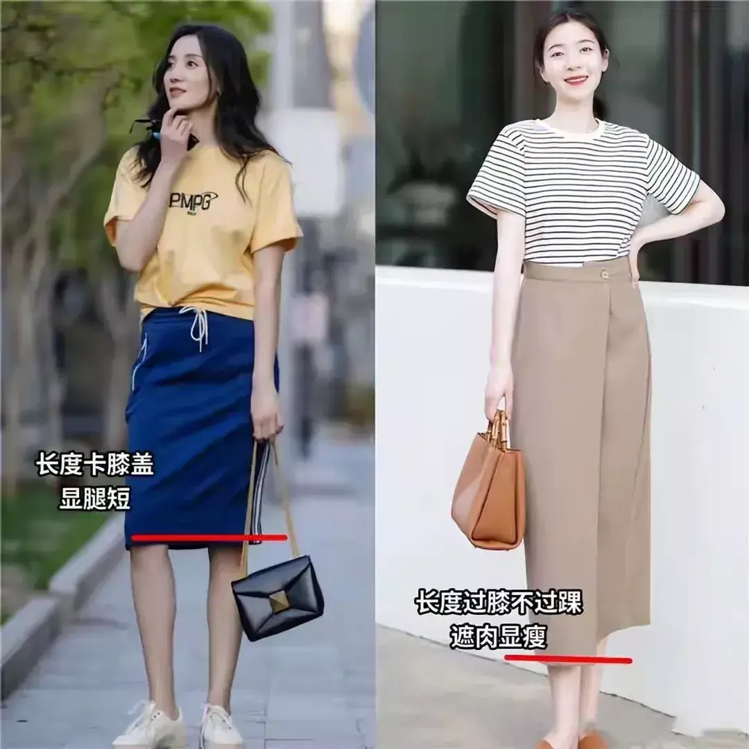 裙子的长度尽量盖过膝盖到小腿肚的位置,露出脚踝最为合适,能遮肉显瘦,如果你穿的裙子长度卡在膝盖的位置会显腿。