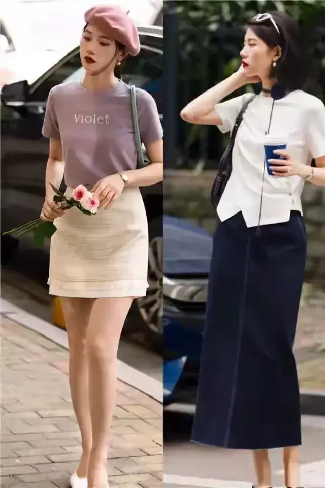 下面这两身穿衣造型就给出了一个很好的答案,紫色的小圆领搭配上白色的半身裙,给人的视觉效果更得体保守。