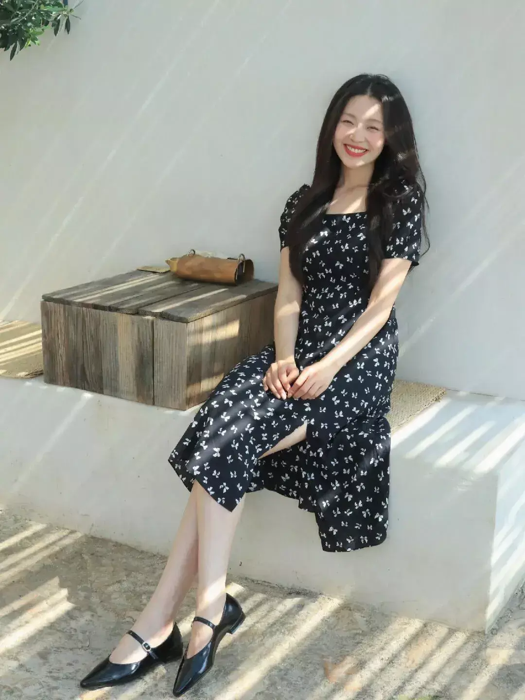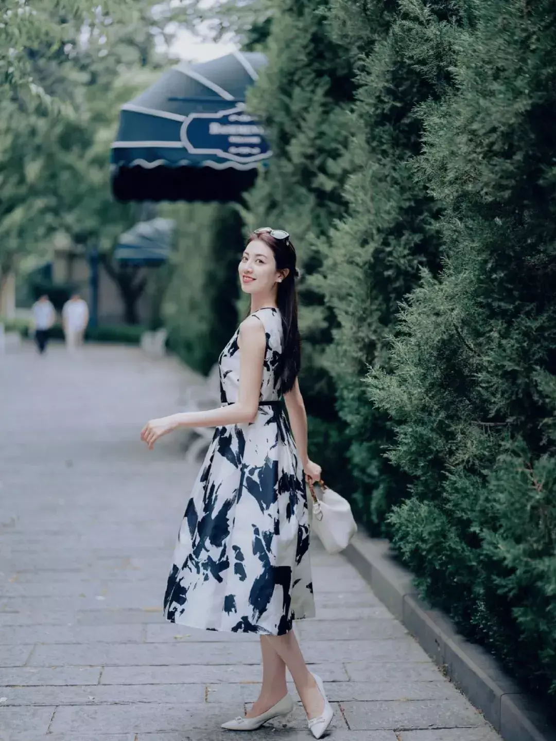 也可以像下面这位博主一样,用一件黑白的印花半身裙,脚上踩着一双尖头的黑色平底鞋,这样的穿衣造型清爽干净利落,而且很优雅。