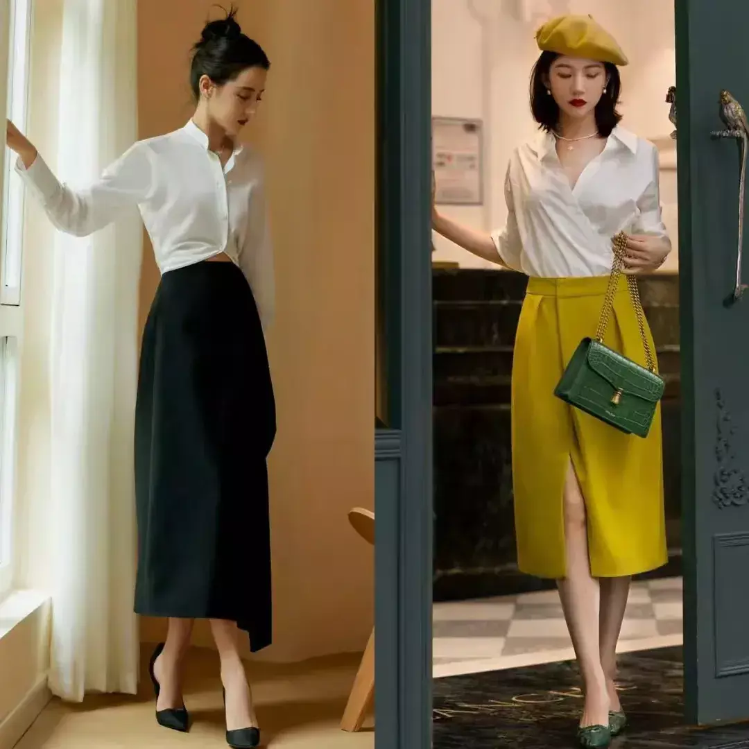 如果基础设显得过于单调的情况下,我们也可以用彩色系的裙子或者是格纹的裙子来进行搭配上纯色系的衬衫,上衣也是很不错的,下面这两位素人的穿衣示范就给出了一个明确的答案。