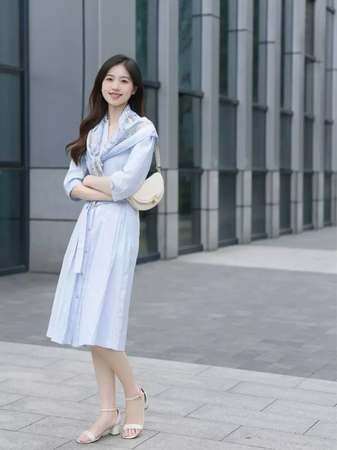 也可以向下面这位博主一样,用浅蓝色的棉麻衬衫连衣裙搭配上粗跟的浅口单鞋,肩膀上挂着一款黄色的夜宵包,还有肩膀上还披了一款丝巾,这种打扮很精致,而且也适合我们普通大众。