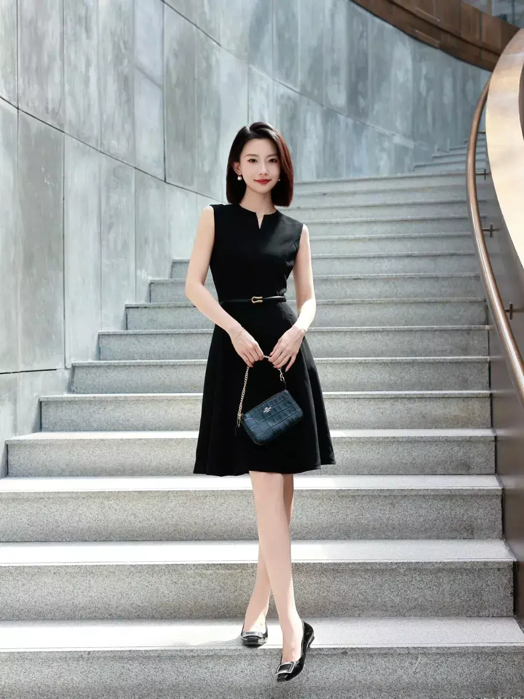 职场女性的话,黑色的裙子最为合适,例如下面这一套的穿衣造型再适合不过了,无袖的高腰收腰连衣裙,腰间的位置还累上了,系腰带勒出小蛮腰,还能达到一个点缀的效果,很精致,搭配上黑色的单鞋,组合上波波头短发造型,女神范十足。