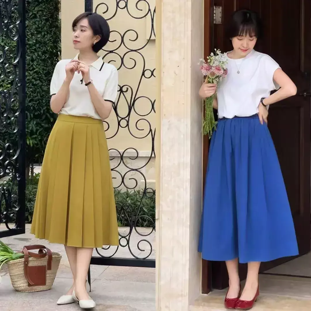 例如下面这一件高腰收腰的伞状半身裙,搭配上白色的短袖上衣,就算你是微胖女性,穿在身上之后也这样显瘦,能展现出好的身材比例,更加优雅,穿裤子就没有这个效果了,会暴露你的缺点。
