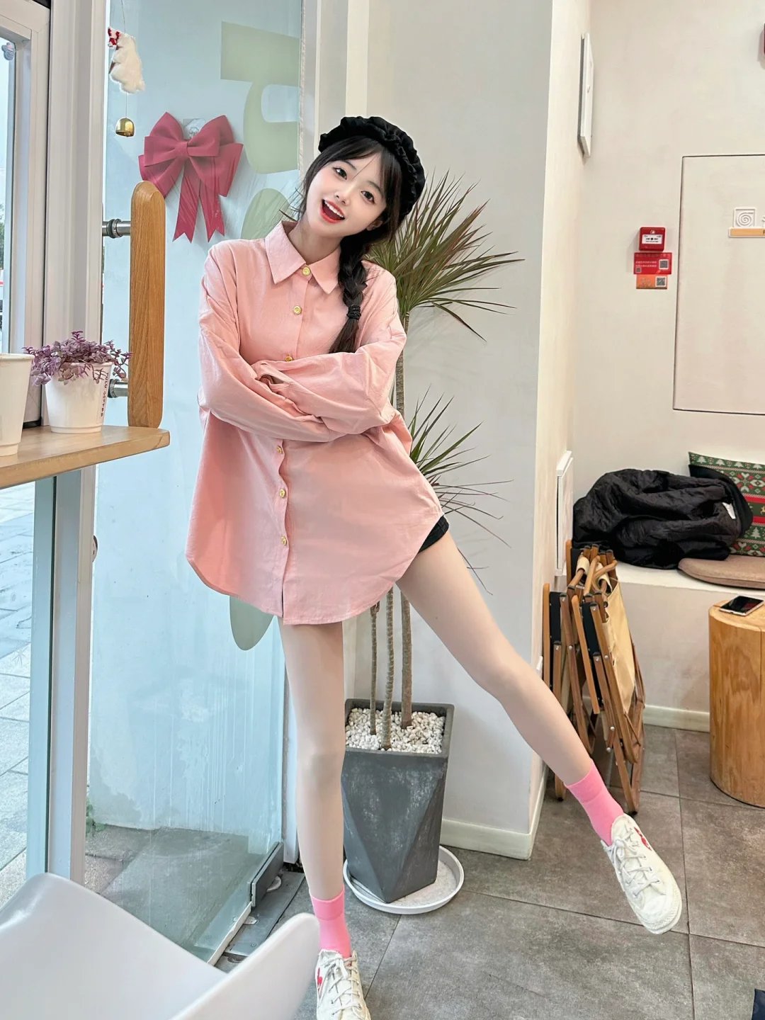 单品选择:挑选一件设计感十足的长款衬衫,可以是纯色基础款,也可以是带有印花、条纹等元素的款式。下装则是一条与衬衫颜色或图案相呼应的短裤或短裙,长度以刚好被衬衫遮盖为宜。