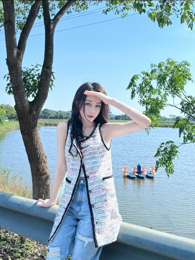 迪丽热啊晒出一组美照中,示范了长款小香风的马甲背心,她内搭选择了简约白色系!下半身搭配破洞牛仔裤,休闲时尚!马甲敞开穿,瞬间可以让原本普通的造型更加时髦性感。