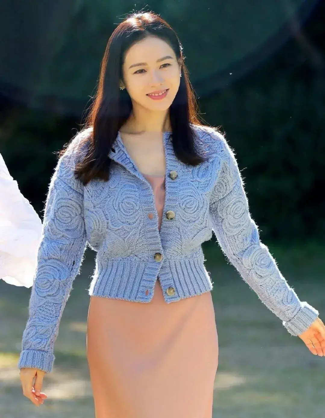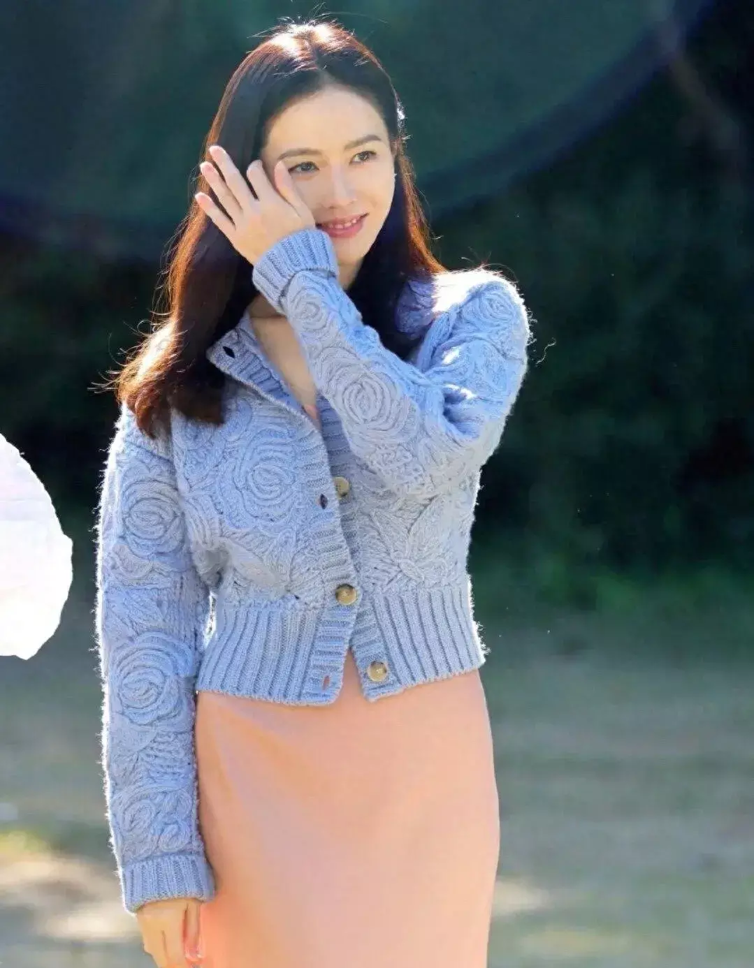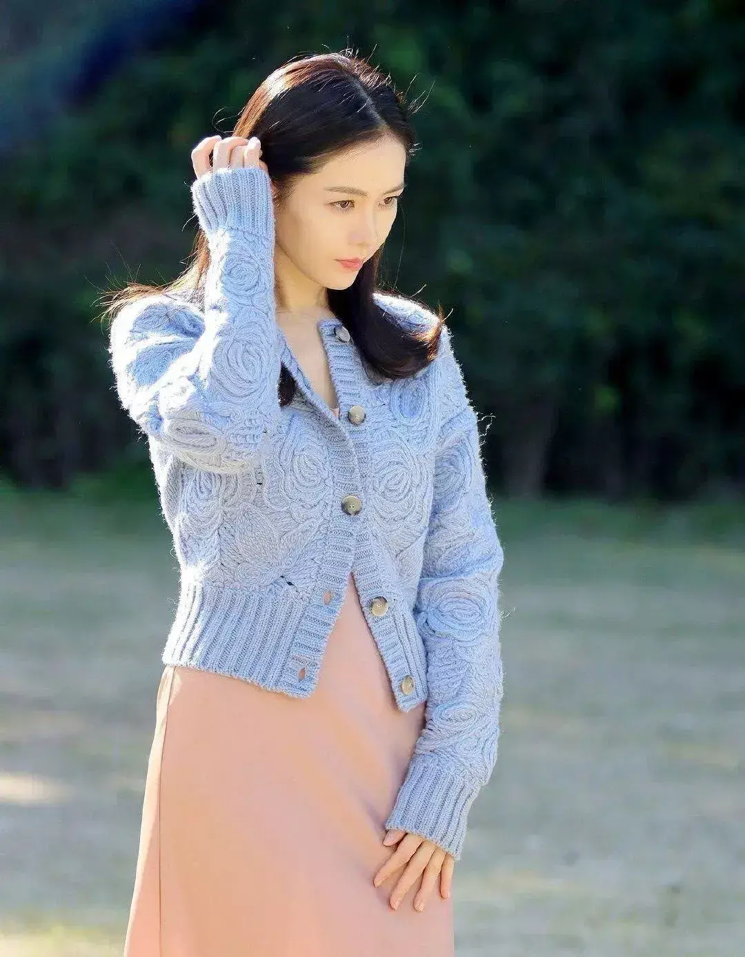蓝色,自古以来便是宁静与深邃的象征。孙艺珍选择的蓝色针织开衫,以其柔和的色调和细腻的质感,仿佛晨曦中轻拂水面的微风,带着一丝不易察觉的凉意与清新。针织材质特有的温暖触感,与蓝色的冷静相互交织,形成了一种既温柔又坚韧的独特魅力。这样的蓝色开衫,不仅能够很好地衬托出穿着者的肤色,更在不经意间流露出一种知性温婉的气质,让人感受到一种远离尘嚣的宁静之美。