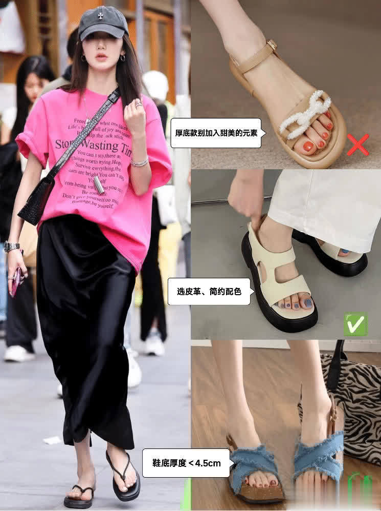 今年的凉鞋流行趋势中确实有厚底设计,厚底设计具有俏皮感,但是它的缺点比优点更加突出和明显,厚底设计的笨重感是无与伦比的,加上平头设计的钝感,这样的鞋子就显得很笨重拖沓,就穿搭效果来说自然就不太好了。