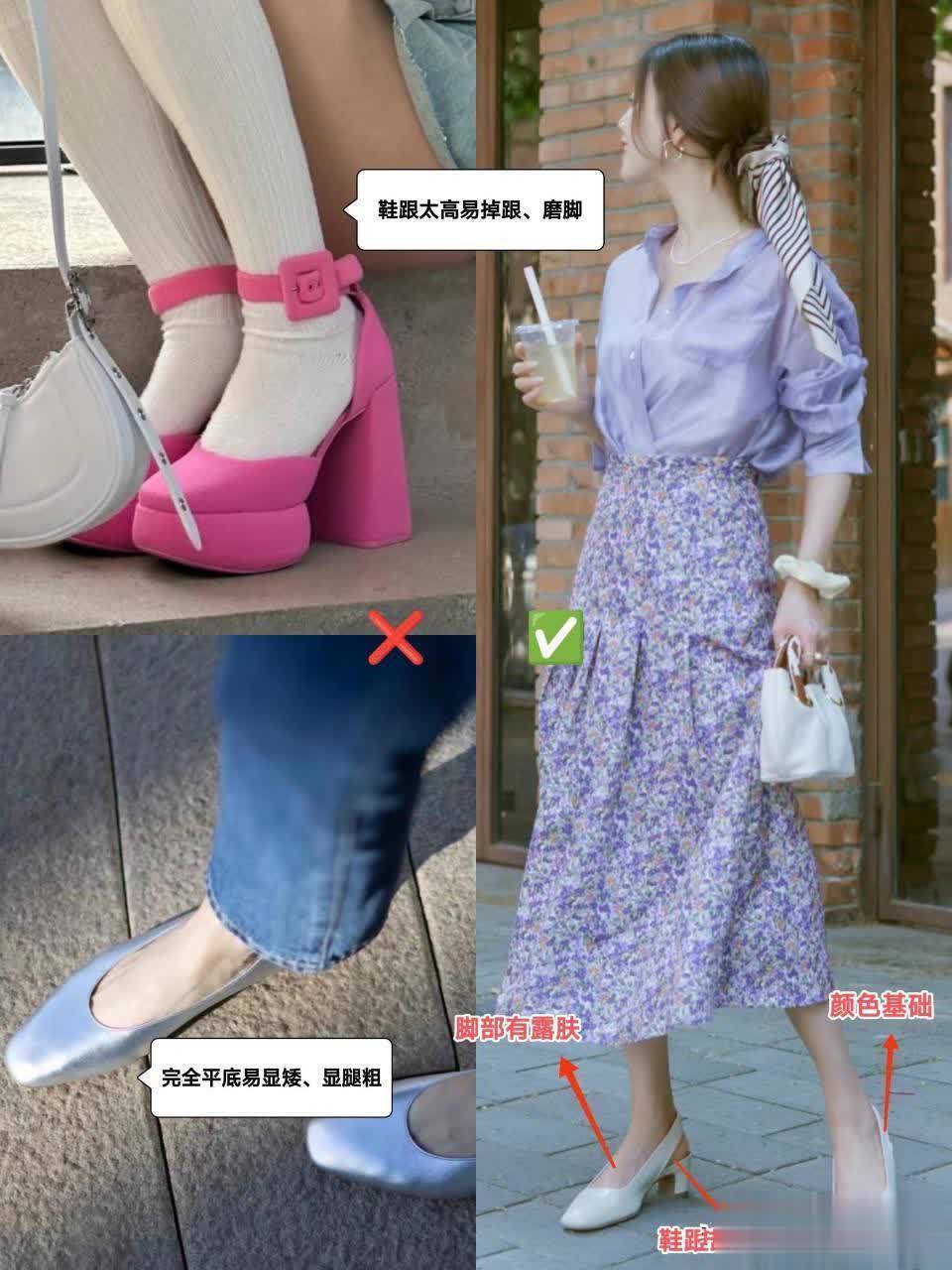然后,颜色当然得选基础色,这样的鞋子才更百搭。最后,平头鞋别配细高跟,尽量配中粗跟,这样配裙配裤都能让整体显得协调。