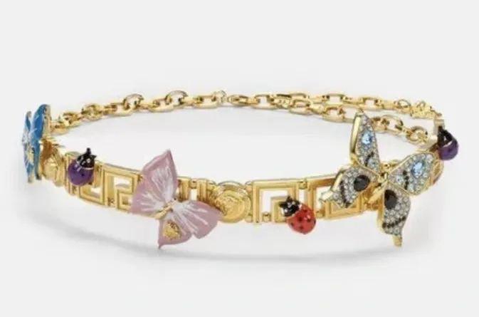 切换一套紫钻连体衣的霉霉搭配了范思哲(Versace)另一条宽链项链,由水晶和珐琅制成,主体图案为珐琅蝴蝶,珐琅瓢虫和美杜莎图案滑扣。