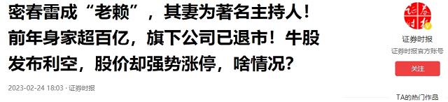 证券时报:2023-02-24:密春雷成“老赖”,其妻为著名主持人!前年身家超百亿,旗下公司已退市!牛股发布利空,股价却强势涨停,啥情况?