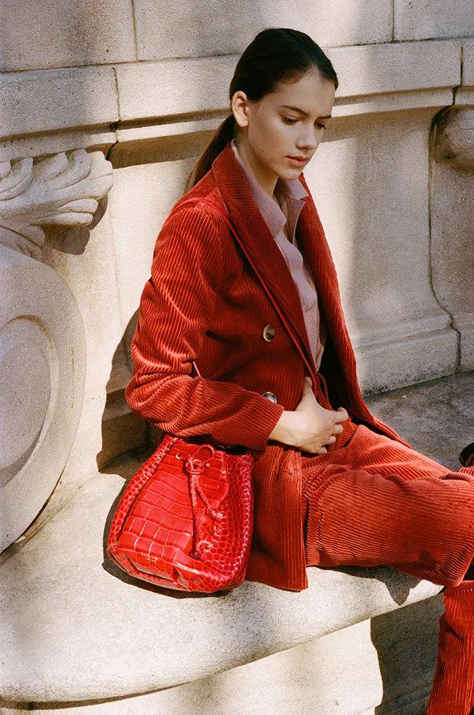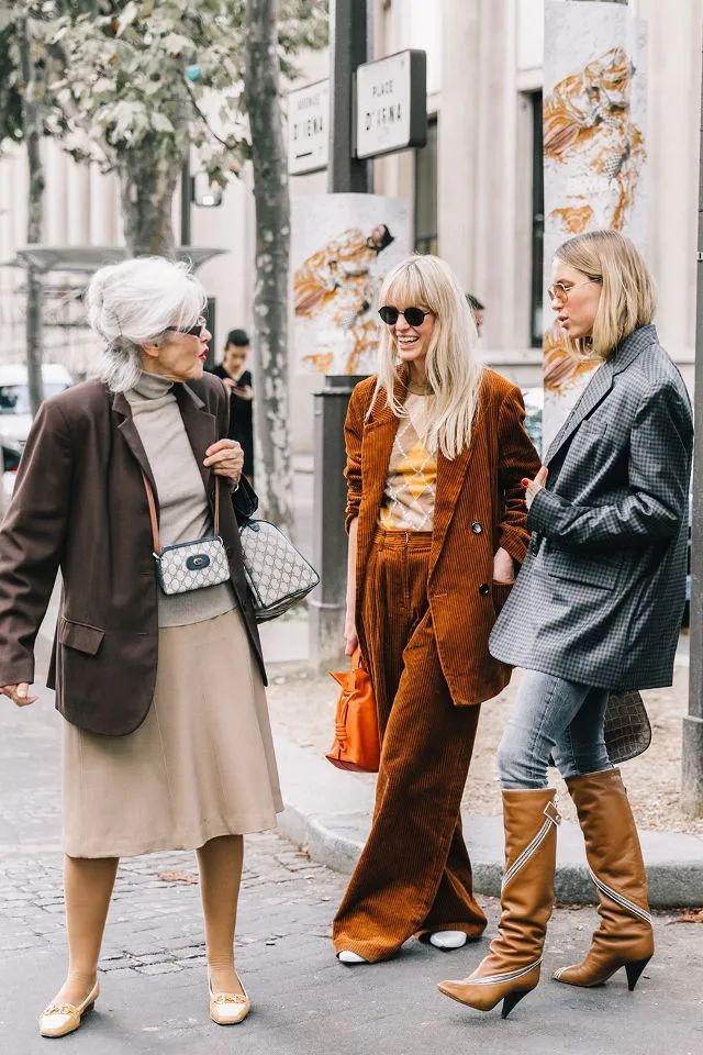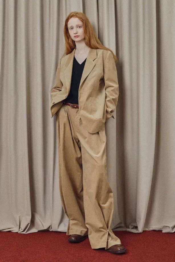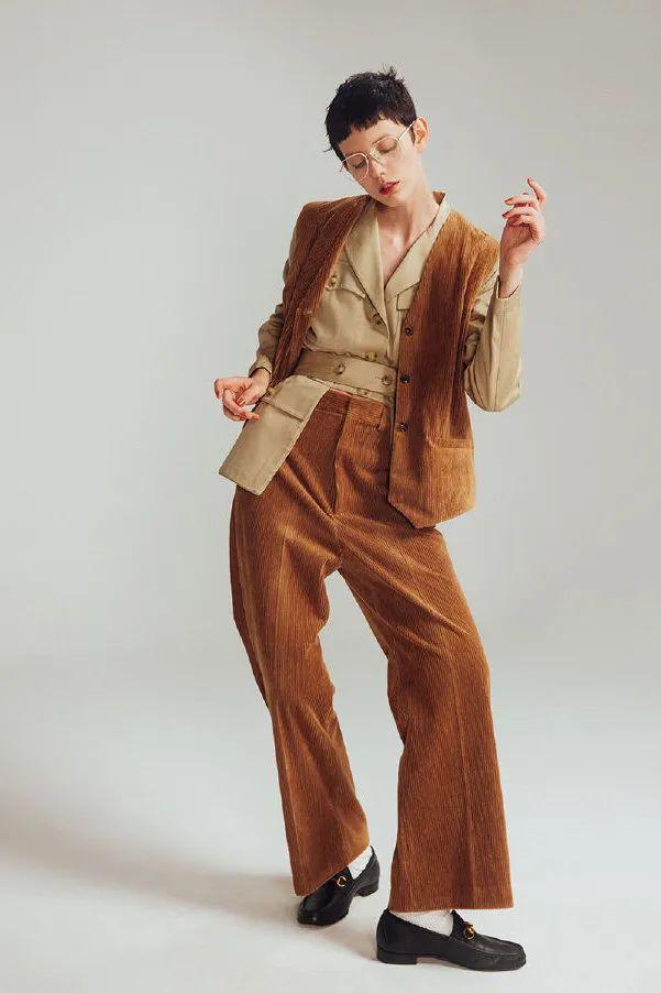 喜欢色彩明悦浓郁一点的,不妨多考虑一下焦糖、红棕这些,饱满生动,质感绝佳。特别是灯芯绒材质的套装,轻松拿捏矜贵复古的腔调,驾轻就熟的时髦。