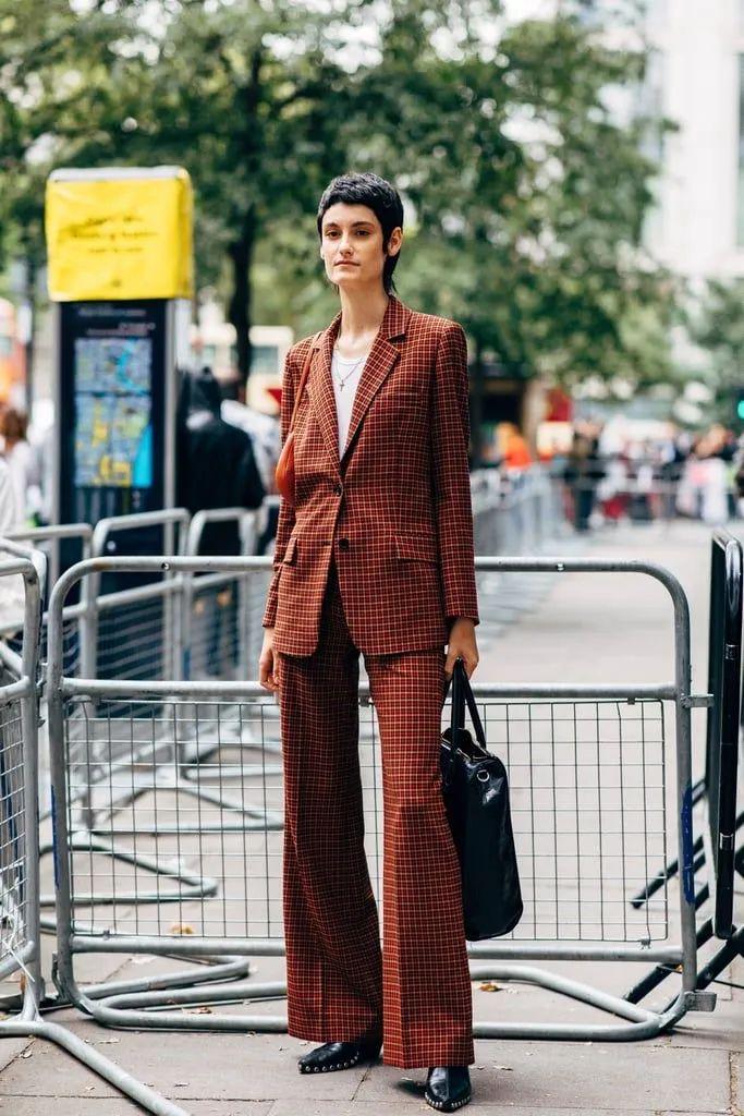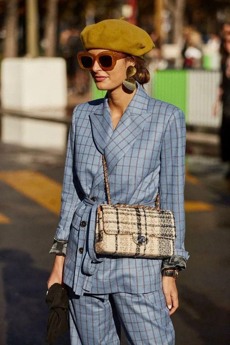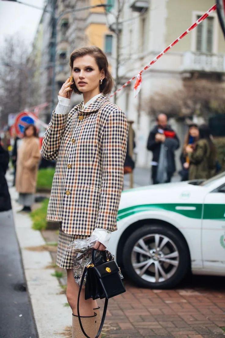 说实话,格纹不好穿,再加上跟套装结合,不小心就会显得硬板。所以 最好选择千鸟格、人字纹、牧羊小方格这些素雅柔和的格纹。