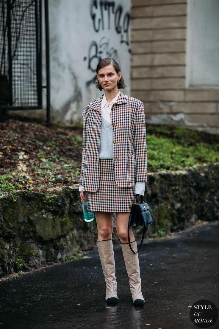 可以用裙子来柔和格纹的中性感,而且小一点的格纹更加精致简练,特别是成套穿的时候,低调的很高调。