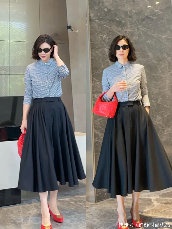 比如说,在穿这种时髦又优雅的格纹衬衫时,她们并不会在下半身去搭配休闲裤,而是换成这种优雅的半身裙,这样的穿搭可以让整个人看上去更温柔大气,半身长裙和衬衫的结合,也很好地体现出了女人味。