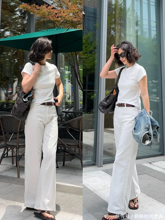 一身白的穿搭更是相当的简洁,这种穿搭方式没有特别复杂的技巧,但是却能够很好地提升我们的品味,尤其是白色T恤和白色阔腿裤,配合腰带更是会显得身材很好。
