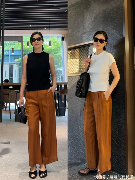 穿上这种短背心和T恤之后,配上高腰的直筒裤或者是阔腿裤,能够有效的去改善我们的身材,想要显瘦很简单。