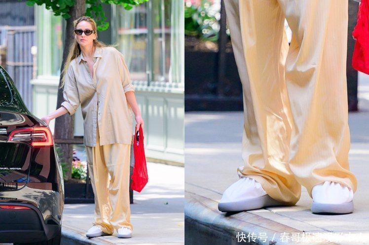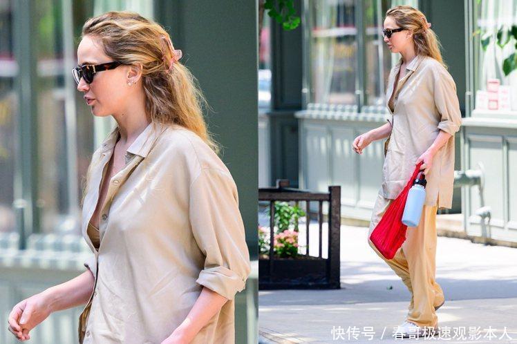 阳光灿烂得让人心情超好的午后,珍妮佛劳伦斯穿着一身超级温柔的奶茶色衬衫,再配上同色系的宽裤,就那么悠悠闲闲地在纽约的大街小巷里晃悠。