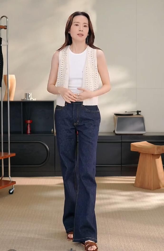 直播间的穿搭也是以简约风为主!白色无袖T恤搭配牛仔裤,外搭一件针织马甲,优雅感就出来了!