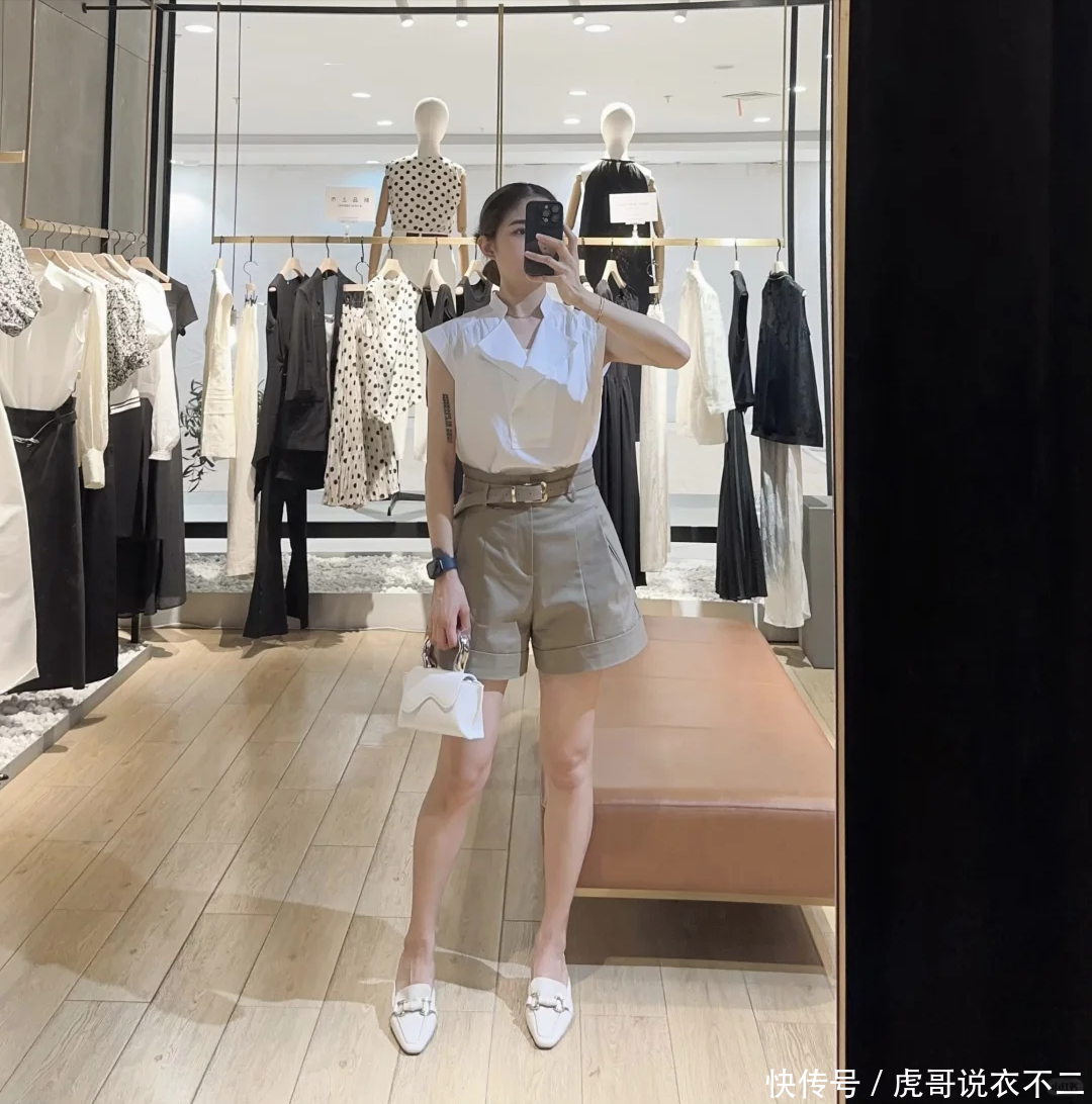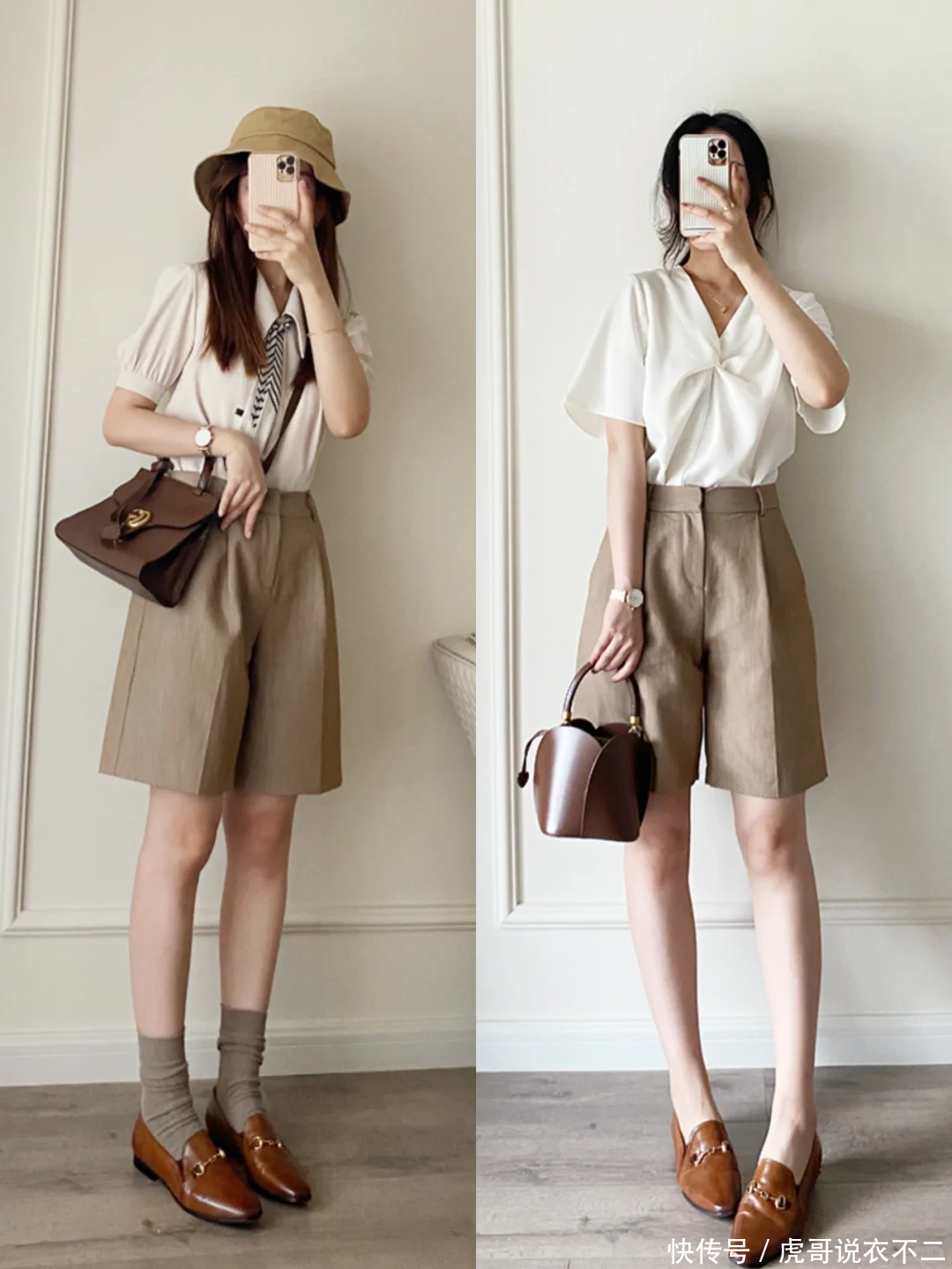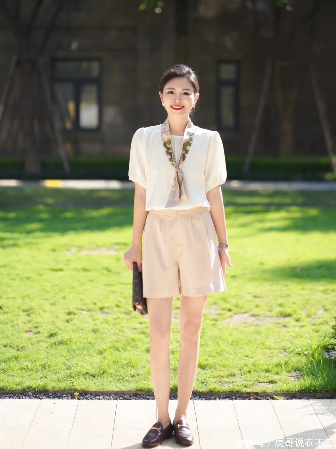 短裤的长度建议控制在膝盖上方几公分,既能展现修长的腿部线条,又不失庄重。脚下踩上一双白色运动鞋或乐福鞋,瞬间提升整体造型的休闲感,无论是日常出行还是办公室轻办公,都能轻松驾驭。