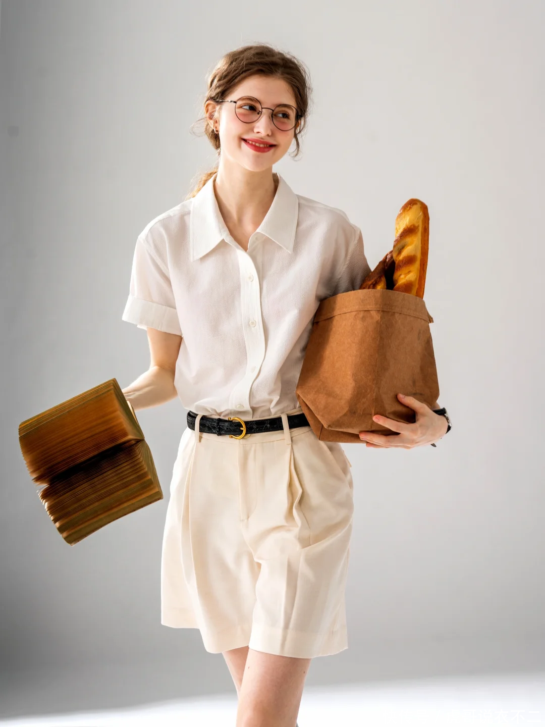 经典的白衬衫,永远是衣橱里的不败单品。选择一件剪裁合体的白色棉质衬衫,微微敞开的领口透露出不经意的随性,搭配一条修身的灰色西装短裤,色彩上形成了简洁而高级的对比。