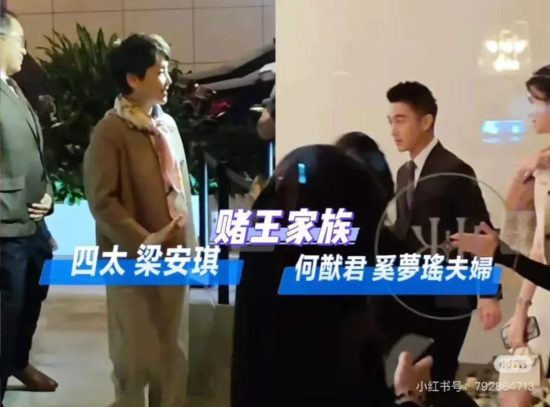 赌王家族中,四太梁安琪与儿子何猷君、儿媳奚梦瑶出席。
