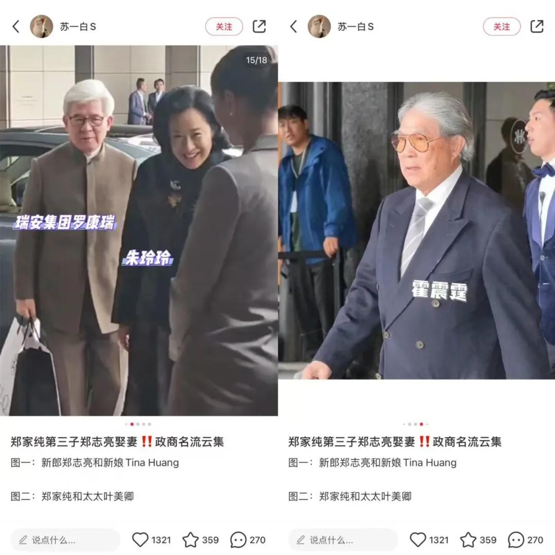 从名媛谢玲玲晒出的图片来看,郑志亮的父母郑家纯和叶美卿在现场坐镇。2016年郑裕彤去世后,儿子郑家纯接任了其家族掌门人的位置,但后续又因病淡出公众视野。