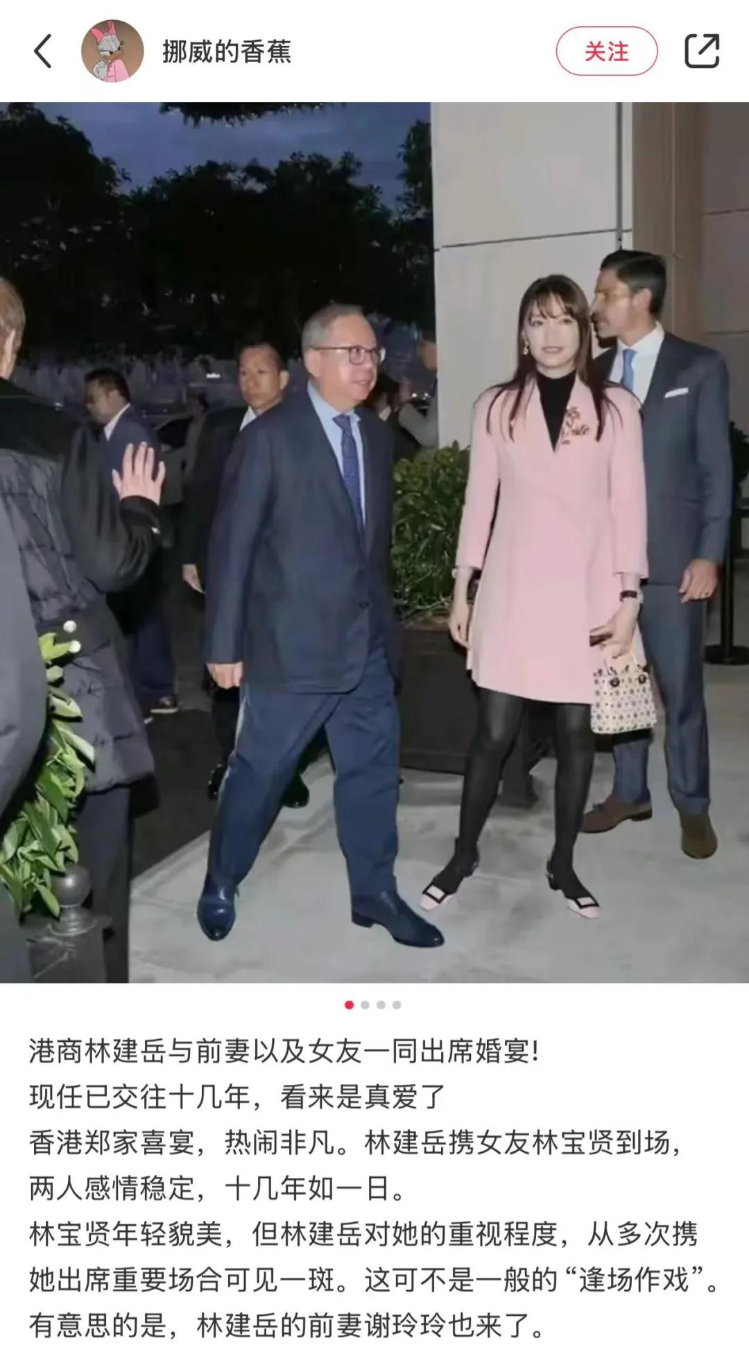 值得注意的是,谢玲玲的前夫林建岳也携女友一同出席婚宴,上演前妻现任同台的“修罗场”。林建岳是广东汕头潮阳人,他是香港著名企业家林百欣的次子,现任丽新集团主席,旗下拥有丽新发展(0488.HK)、丽新国际(0191.HK)与鳄鱼恤(0122.HK)三家独立上市公司。
