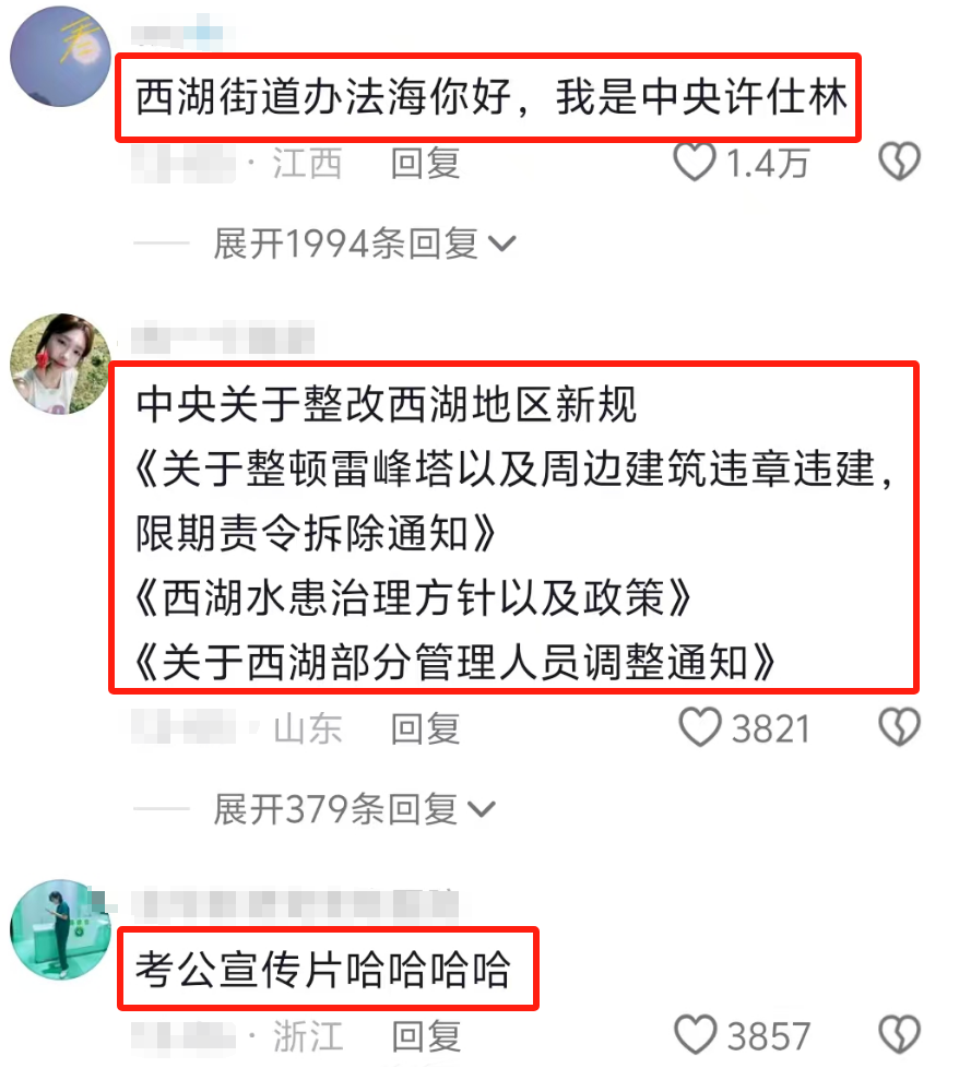 关于许状元“捞人”这一情节,有考公的学生调侃:许状元在相关人员陪同下,整顿雷峰塔及周边危老旧建筑,视察西湖,及探望为国祈福的母亲。